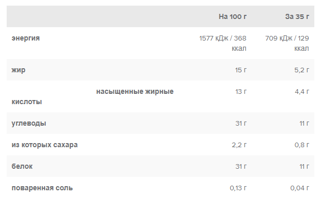 Білкова суміш (33%) (концентрат сироваткового білка ( молоко), ізолят соєвого білка, ізолят молочного білка, яловичий колаген), фруктоолігосахариди, какао-покриття (20%) (мальтит, кокосовий жир, какао-порошок (20%), емульгатор (лоцитіни), натуральний ароматизатор), зволожувач (гліцерин, сорбітол), кокосова олія, кокосова стружка (3%), емульгатор (лецитин), натуральний ароматизатор, регулятор кислотності (лимонна кислота), емульгатор (моно- і дигліцериди жирних кислот), вітаміни (вітамін C, ніацин, пантотенова кислота, вітамін B6, фолієва кислота). Надмірне вживання може мати послаблювальний ефект.