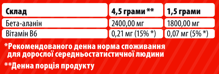 BETA ALANINE – дієтична добавка, джерело бета-аланіну. Підвищує витривалість за рахунок зниження рівня молочної кислоти у м'язах та підтримує нормальний енергетичний обмін.