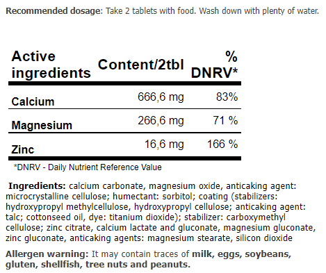 Мінерали важливі для правильного функціонування організму . Якщо ви не отримуєте необхідну кількість у своєму звичайному раціоні, ви можете покластися на добавку Amix Nutrition. Містить суміш кальцію, магнію та цинку. Кальцій необхідний підтримки здоров'я кісток і зубів. Він урівноважує енергетичний обмін та підтримує нормальну роботу м'язів. Магній знижує втому та скорочує час регенерації. Цинк підтримує нормальний стан волосся, нігтів та кісток та захищає клітини від окисного стресу. Завдяки збалансованому співвідношенню всіх речовин таблетки Amix Nutrition допоможуть покращити свої спортивні результати.