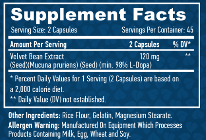 Mucuna Pruriens, або Scabies Pruriens, є природним джерелом леводопи. Добавка Haya labs має дуже високий ступінь стандартизації, 98%. Важливо зазначити, що спортсменам також дуже потрібен високий рівень дофаміну. Це призводить до більшого викиду важливих для нашого організму гормонів, як-от соматропін або тестостерон. Ця речовина також підвищує лібідо та позитивно впливає на статеву функцію.