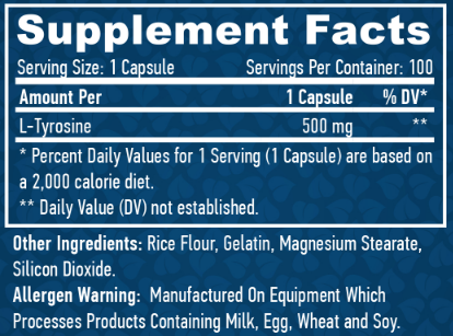 L-тирозин — незамінна амінокислота, що виробляється в організмі з фенілаланіну (незамінна амінокислота). Як попередник адреналіну, норадреналіну, допаміну та гормонів щитоподібної залози, він надзвичайно важливий для обміну речовин. Тирозин підтримує здорову функцію надниркових залоз і гіпофіза. Наднирники регулюють гормони стресу.